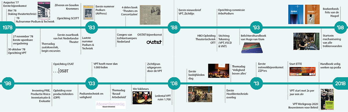 Op 30 oktober 1978 werd de Vereniging voor Podiumtechnologie officieel opgericht. Ook theatertechnici maakten vanaf het begin deel uit van de vereniging, zoals Chris Lievaart, destijds Hoofd Technische Organisatie bij De Nederlandse Opera. Op 27 november 1978 vond de eerste openbare vergadering plaats in Theater De Krakeling in Amsterdam. Diezelfde dag verscheen het nulnummer van Podium & Techniek, het vakblad van de vereniging. Binnen een jaar groeide de VPT naar 369 leden, een duidelijk signaal dat er behoefte was aan een plek om kennis en ervaring te delen.